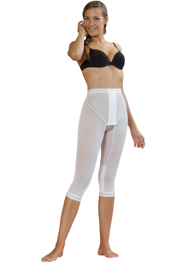 The panty long stocking is prescribed following liposuction of the lower abdomen, hips, pelvis, thighs and knees. Its compressive action allows the restraint of the postoperative edema that occurs following liposuction. The phenomenon of “waves” is thus avoided.