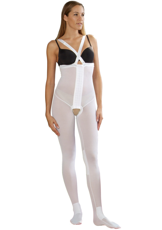 The panty top covers the lower body from the breast fold to the feet as a result of liposuction of the belly, hips, pelvis, thighs, knees, calves and ankles. Its specially designed compression ratio allows compression of the postoperative edema, while providing the patient with ease and mobility.